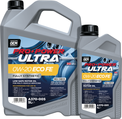 Pro Power Ultra 0W-20 ECO-FE is a fully synthetic low SAPS, fuel efficient motor oil suitable for use in both petrol and diesel engines, designed to give maximum protection to petrol and diesel particulate filters. The advanced formulation offers Low Speed Pre-Ignition (LSPI) protection. Recommended for many modern Vauxhall/Opel, BMW, Mercedes-Benz, Jaguar Land Rover, Hyundai, Kia, Toyota and others.