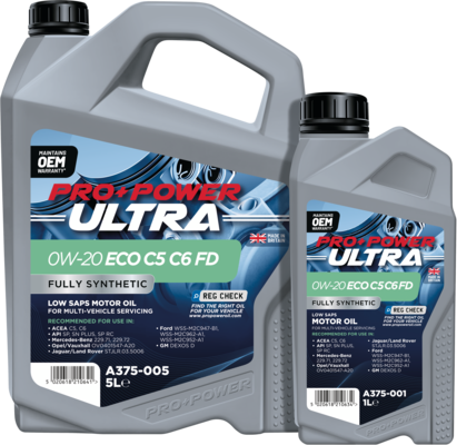 Pro Power Ultra 0W-20 ECO C5 C6 FD is a fully synthetic low SAPS, fuel efficient motor oil suitable for use in both petrol and diesel engines. Designed to give reductions in fuel consumption and excellent protection during cold start up. Recommended for many modern vehicles, including those from Ford, Vauxhall/Opel, Mercedes-Benz, Jaguar Land Rover, Hyundai, Kia, Toyota and others.