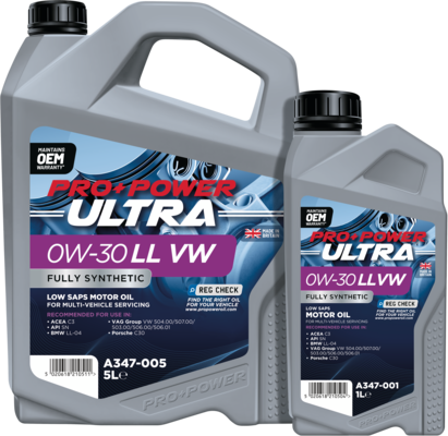 Pro Power Ultra 0W-30 LL VW is a fully synthetic low SAPS, fuel efficient motor oil suitable for use in both petrol and diesel engines, designed to give reductions in fuel consumption and excellent protection during cold start up. Recommended for many modern vehicles, including those from Volkswagen Group, BMW, Porsche and others.