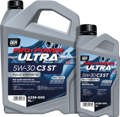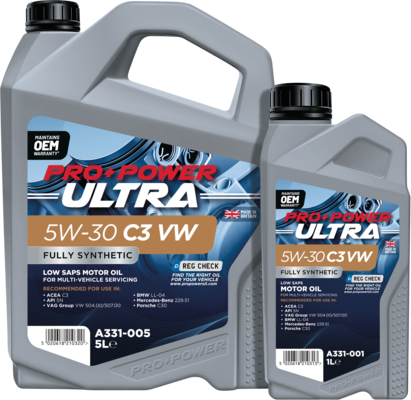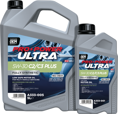 Pro Power Ultra 5W-30 C2 / C3 PLUS is a fully synthetic, low SAPS, fuel efficient motor oil suitable for use in both petrol and diesel engines. It is designed to give maximum protection to diesel particulate filters (DPF). Recommended for many modern vehicles, including those from Vauxhall, Mercedes-Benz, Peugeot/Citroën and others.