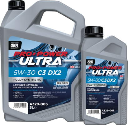 Pro Power Ultra 5W-30 C3 DX2 is a fully synthetic, low SAPS, fuel efficient motor oil suitable for use in both petrol and diesel engines. It is and designed to give maximum protection to diesel particulate filters (DPF). Recommended for many modern vehicles, including those from Vauxhall, BMW, Mercedes-Benz, VW, Renault and others.