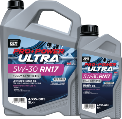 Pro Power Ultra 5W-30 RN17 is a fully synthetic low SAPS, fuel efficient motor oil suitable for use in both petrol and diesel engines, designed to give maximum protection to petrol & diesel particulate filters. Recommended for many modern vehicles, including those from Renault and others.